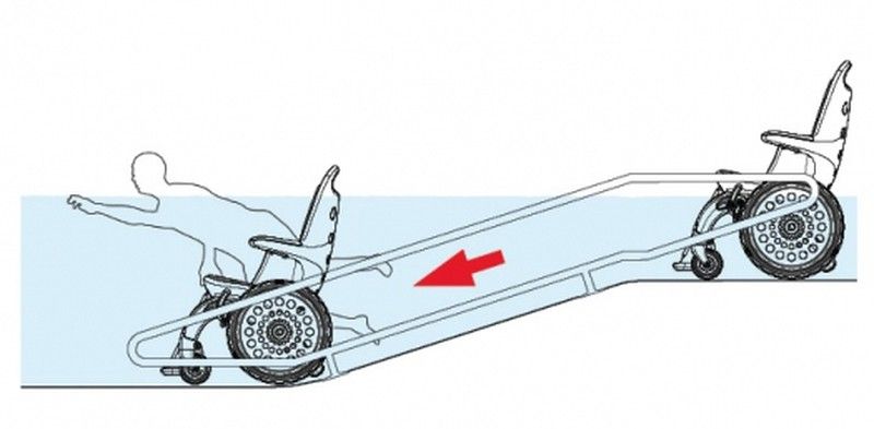 Le châssis de la chaise est équipé de trous qui lui permettent de se remplir rapidement d'eau lorsqu'il est immergé : de cette manière, il ne flotte pas et ne déstabilise pas l'utilisateur. Ces mêmes trous de drainage videront automatiquement la chaise en sortant de l'eau.