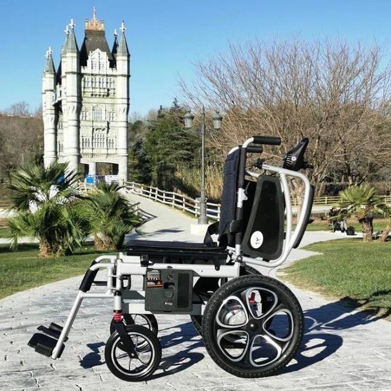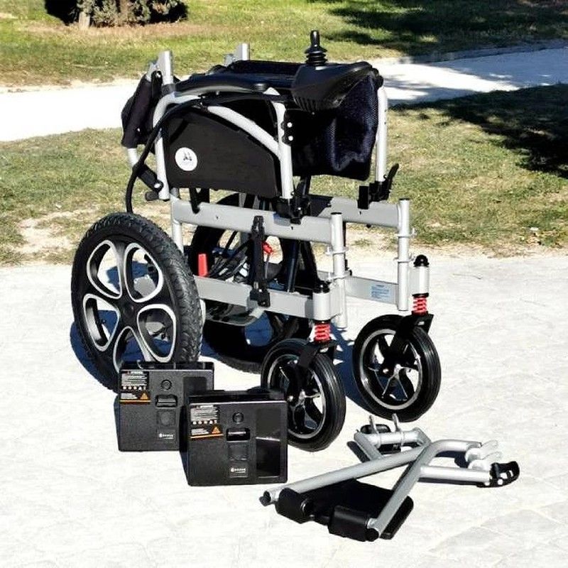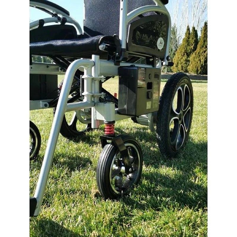 Le châssis de la chaise électrique ELBA dispose d'un système d'amortissement qui permet d'utiliser l'appareil sur des terrains accidentés, de plus les roues sont pleines et increvables ou pneumatiques. Les avant ont un diamètre de 23 cm et les arrière mesurent 41 cm.