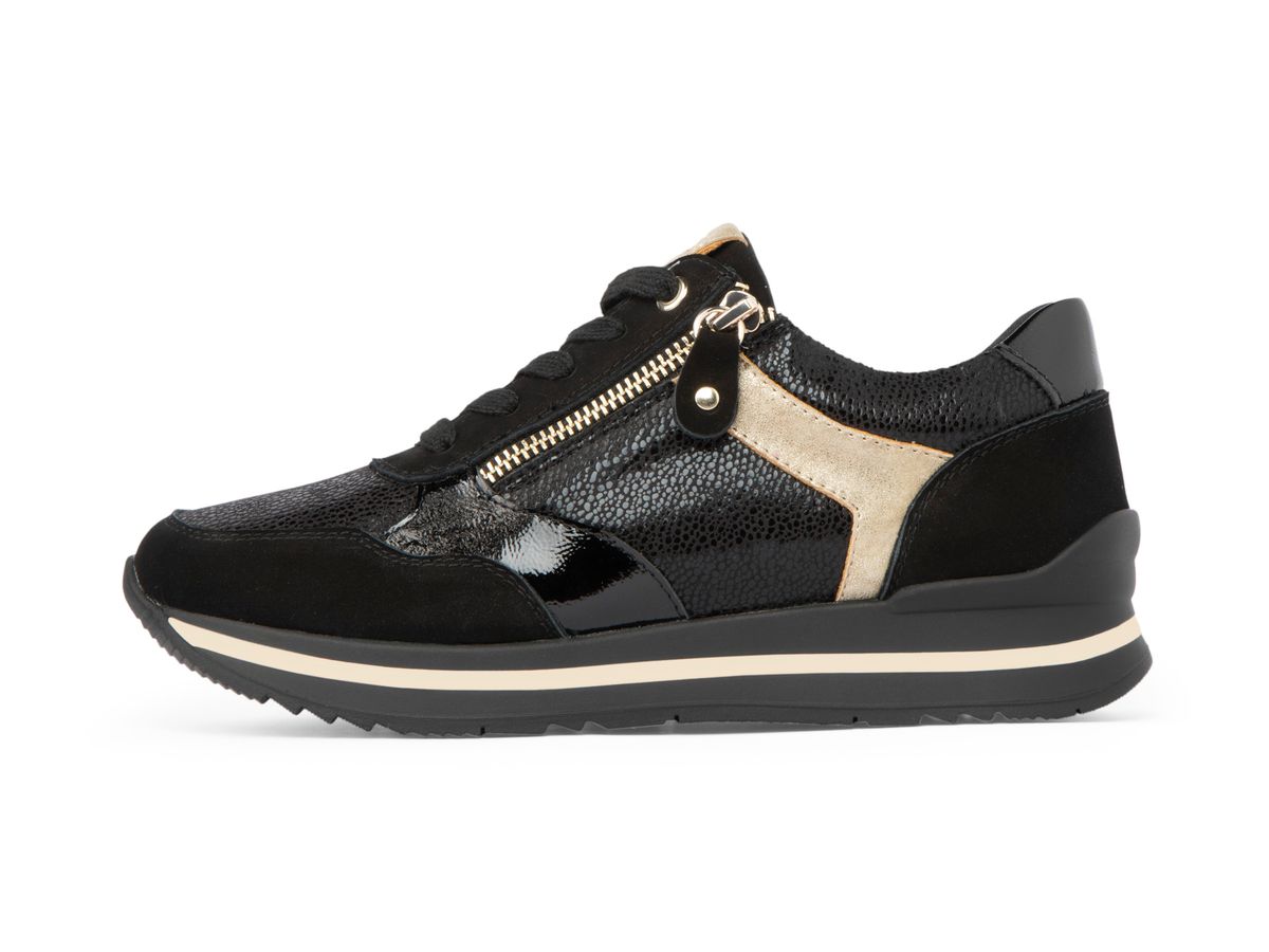 Cette basket à fermeture éclair latérale offre un enfilage rapide et facile, tandis que les lacets assurent un maintien sûr et personnalisé. La finition en cuir de haute qualité et les détails dorés ajoutent une touche d'élégance, parfaite pour toutes les occasions, qu'il s'agisse d'un look décontracté ou d'une sortie plus audacieuse.
