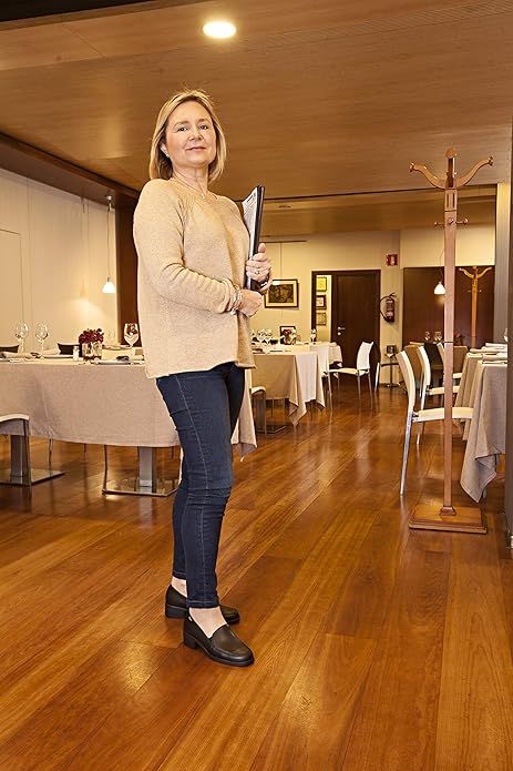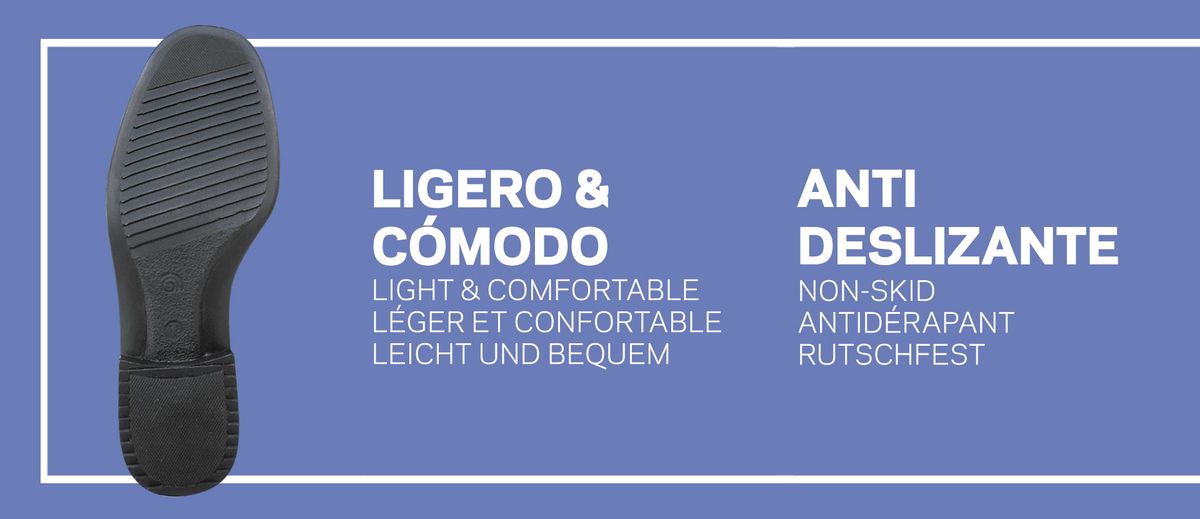 Chaussure femme avec fermetures latérales élastiques, fabriquée en micro-cuir D'COVER PLUS® et doublée de tissu technique D'DRY® sur la tige. Coupe droite à bout arrondi. Contrefort de talon suffisamment ferme pour soutenir le talon. Semelle intérieure rembourrée en tissu sur mousse polyuréthane avec traitement antibactérien et charbon actif. Semelle antidérapante en polyuréthane.