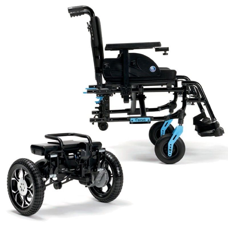 Facile à démonter. Pour le transport ou le rangement. Tous les composants du fauteuil roulant électrique convertible Verso sont faciles à transporter et légers (16,2 kg pour la partie la plus lourde et 9,9 kg pour le châssis), ce qui permet de le transporter sans problème dans le coffre d'une voiture. Il se démonte en quelques secondes. Le châssis et la partie électrique du fauteuil sont équipés d'une roue supplémentaire, garantissant ainsi l'absence de dommages lors du démontage et facilitant la maniabilité. Comme tout fauteuil roulant manuel pliable, le siège du nouveau Verso est également pliable, réduisant ainsi l'espace de rangement et de transport. Le fauteuil roulant électrique convertible Verso est compatible avec les voyages en avion.