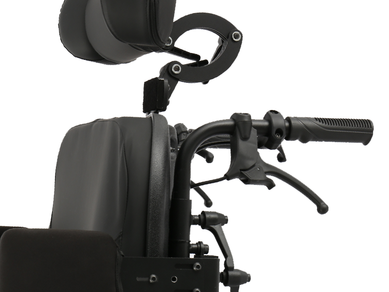 Les poignées du fauteuil roulant abritent les commandes d'inclinaison du dossier et/ou de l'assise, situées dans une position accessible et ergonomique pour l'accompagnant ou le soignant. Ces commandes permettent un contrôle précis et fluide des mouvements d'inclinaison et d'inclinaison, permettant d'adapter facilement la posture de l'utilisateur à ses besoins cliniques ou de confort.