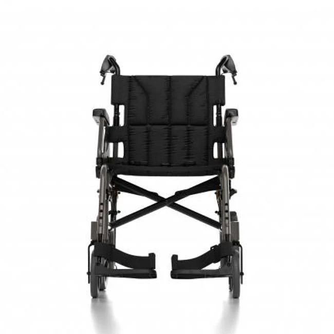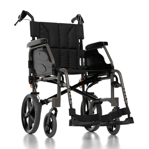 Le poids réduit du châssis rend ce fauteuil roulant très confortable à utiliser et très facile à pousser pour l'accompagnateur. Le châssis plus étroit et la base plus courte offrent un rayon de braquage plus petit et une meilleure maniabilité dans les espaces restreints. Équipements de série : freins pour l'accompagnateur, freins pour l'utilisateur, ancrages de transport, poche et ceinture de sécurité. Largeur d'assise : 405/430/455/480 mm Profondeur d'assise : 400 mm Angle d'assise : 3° Hauteur d'assise : 485/510 mm Angle du dossier : 7° Hauteur du dossier : 430 mm Angle du châssis avant : 80° Longueur du repose-pieds : 330/460 mm Hauteur des accoudoirs : 280 mm Largeur hors tout : Largeur d'assise + 100 mm Largeur totale pliée : 250 mm Longueur totale (repose-pieds inclus) : 995 mm Longueur totale (sans repose-pieds) : 760 mm Hauteur totale : 975 mm Dégagement au-dessus des obstacles : 7° Rayon de braquage : 870 mm Max. Poids de l'utilisateur : 125 kg Poids total : 13,1 kg (partie la plus lourde : 10,2 kg)