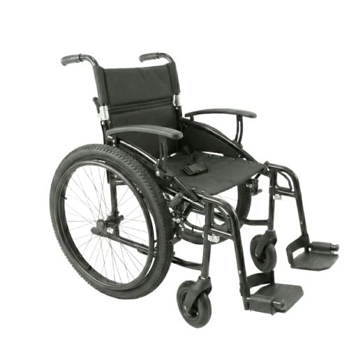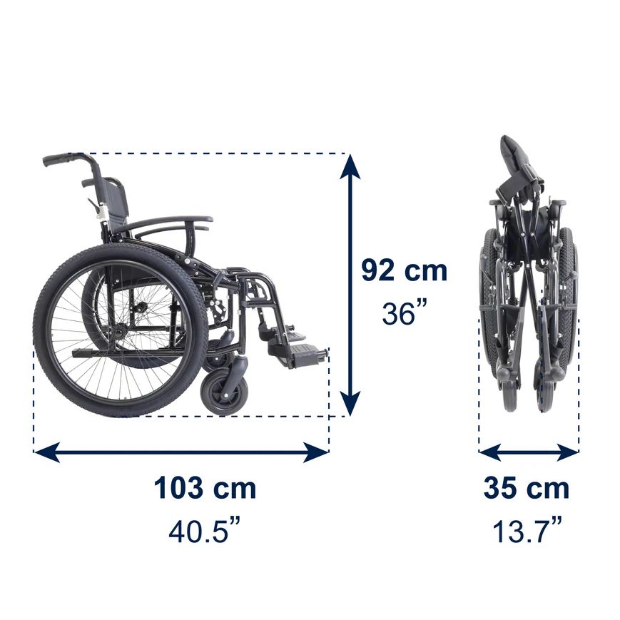 ROUES LARGES Le fauteuil roulant KMINA, léger et pliable en aluminium, est conçu pour offrir un maximum d'autonomie, de confort et de sécurité, aussi bien à l'intérieur qu'à l'extérieur. Grâce à son système de frein à main et à sa ceinture de sécurité intégrée, l'utilisateur se déplace en toute confiance. ACCOUDOIRS ET REPOSE-PIEDS PLIABLES Son design ergonomique comprend un dossier rabattable, des accoudoirs réglables sur 5 positions et des repose-pieds rabattables, pour un confort optimal au quotidien et une entrée/sortie facilitée. SÉCURITÉ ET ESPACE DE RANGEMENT Ce fauteuil roulant est équipé d'une ceinture de sécurité pour une protection accrue et d'une poche arrière pour ranger de petits objets. PLIABLE Le fauteuil roulant KMINA se plie facilement, réduisant ainsi ses dimensions (35 x 87,5 x 76 cm) pour un transport et un rangement aisés.