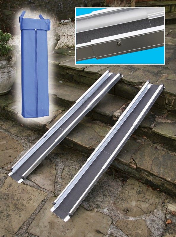 Ces deux rampes rétractables sont spécialement conçues pour faciliter le transport. Fabriqué en aluminium anodisé léger. Comprend un sac de rangement. Des bords surélevés (5 cm de haut) des deux côtés de la rampe maintiennent le fauteuil roulant ou le scooter en place.